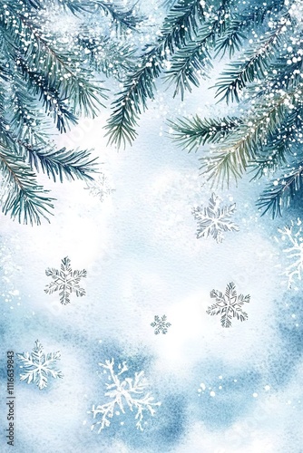 Snowflakes gently fall against a soft blue backdrop with pine edges.