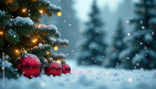 Snowflakes gently falling on a festive winter scene with ornaments and evergreen trees, evergreen, Christmas