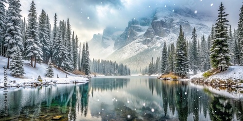Snowflakes gently falling on frozen forest lake surrounded by snow-laden evergreen trees and rugged rocky mountain cliffs in misty afternoon with warm softbox light.