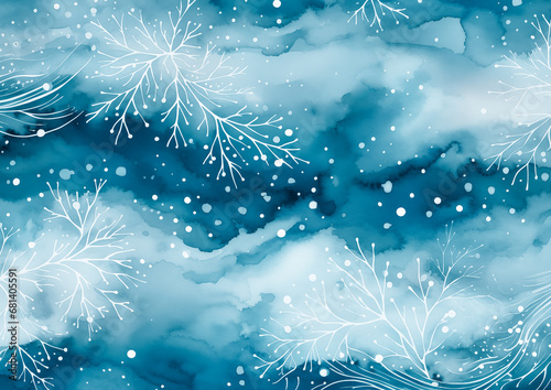 Snowflakes watercolor blue sky, white snow abstract background. Minimalist winter wonderland aqua watercolor texture graphic resource for copy space. Holiday New Year weather travel backdrop by Vita
