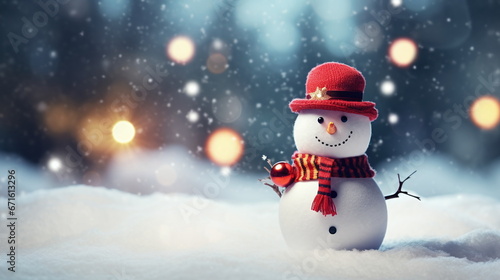 Snowman in a red hat and a Christmas ball in his hand copy space