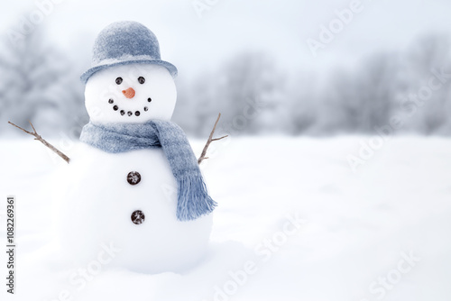 Snowman in a scarf and hat during, copy space.