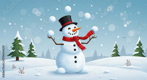 Snowman juggling snowballs winter scene