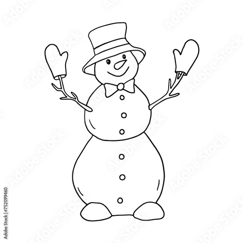 Snowman wearing a hat and mittens with his hands up in the air. A cheerful winter illustration drawn by hand. Coloring. Isolated on a white background.