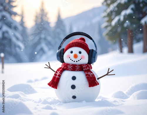 Snowman Wearing Headphones Enjoys Winter Music in a Snowy Forest on a Sunny Day