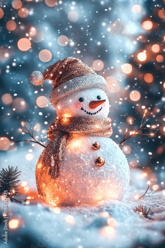 Snowman wearing knitted hat and scarf enjoying winter snowfall