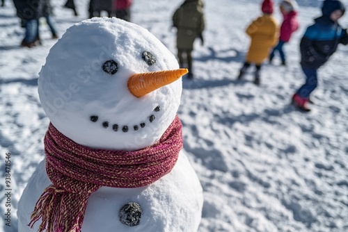 Snowman with a carrot nose and scarf and kids playing around in a snowy field.
