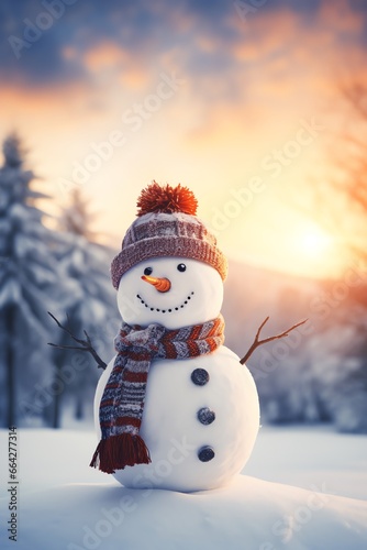 Snowman with scarf and hat in winter forest. Christmas background.
