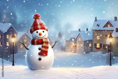 Snowman with the hat and scarf standing on the snow in winter, christmas trees on the side and behind it