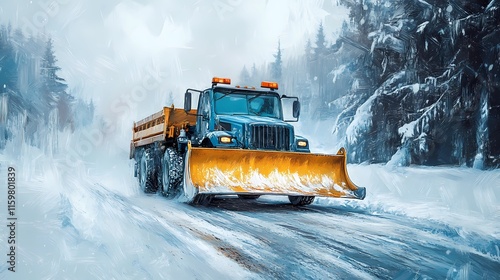 Snowplow machine removing snow on a rural road, providing access after snowfall, illustrated in a soft, painterly art style