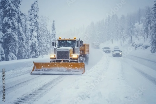 Snowplow truck clearing snow from a mountain road during a blizzard, ensuring safe passage for other vehicles in challenging winter conditions