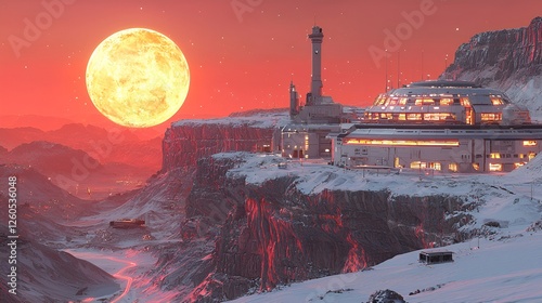 Snowy alien planet base at sunset