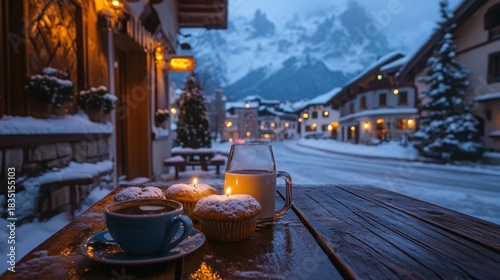 Snowy Alpine Village Cafe at Dusk with Coffee and Muffins