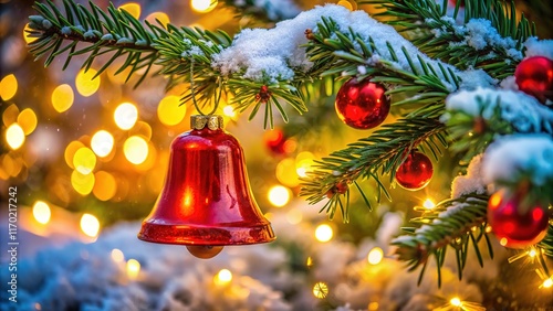 Snowy Christmas Tree with Red Bells and Lights - Festive Holiday Scene