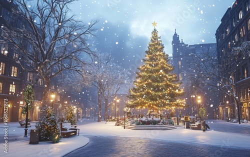 Snowy City Square Festive city square blanketed in snow, featuring a large Christmas tree with twinkling lights and holiday decor, perfect for holiday card mockups