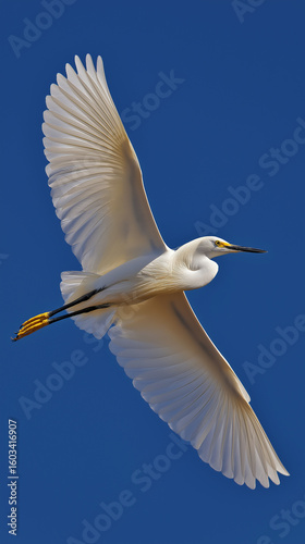 Snowy egret flies with outspread wings vertical