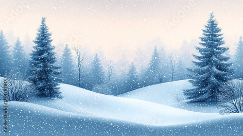 Snowy forest landscape with blue trees. Watercolor winter scene with snow-covered trees and a serene sky,