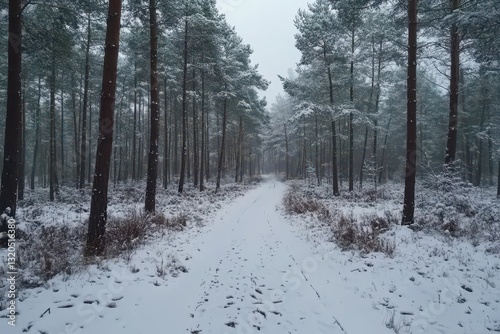 Snowy Forest Path in Winter with Tall Trees and Soft Snow Cover