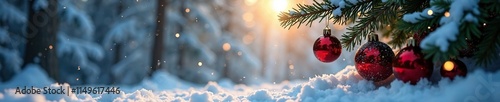 Snowy forest scene with Christmas tree ornaments suspended in mid-air under soft lighting, ornaments, suspended