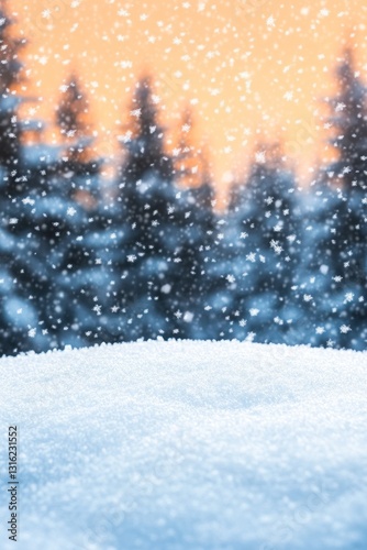 Snowy landscape with falling snow and blurred pine trees at sunset.