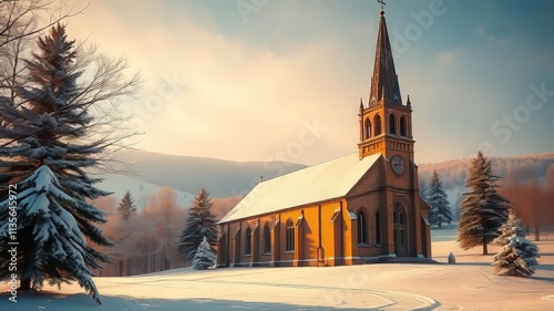 Snowy Morning Light on Historic Church Steeple - AI Photo