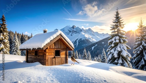 Snowy mountain cabin at sunrise