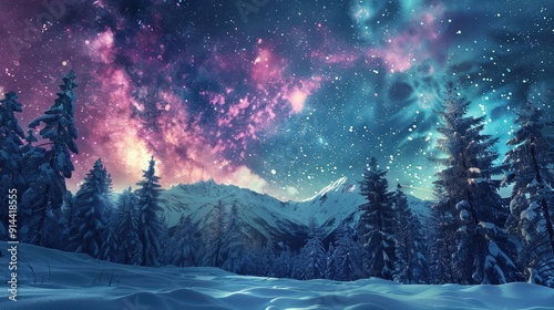 Snowy mountain forest under a vibrant, colorful night sky with stars.