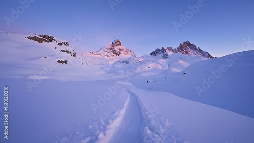 Snowy Mountain Landscape at Dusk with Path and Pink Toned Peaks under a Clear Blue Sky Beautiful Winter Scenery