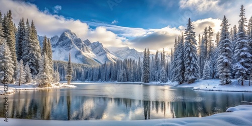 Snowy mountain landscape with frozen lake and pine trees, winter, forest, winter, forest
