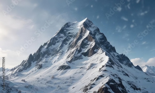 Snowy mountain peak covered in frost and snow flakes gently falling from the sky, illumination, light bulb