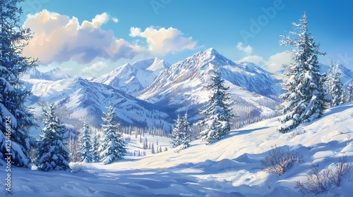 Snowy Mountain Vista with Pine Trees and Fluffy Clouds in a Winter Landscape Painting