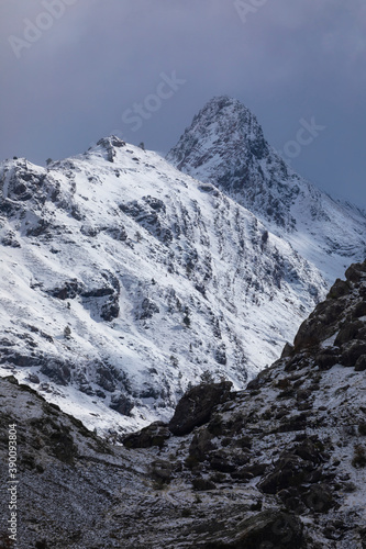 Snowy mountains landscape in the Aragonese Pyrenees. Near of Aguas Tuertas valley, Hecho and Anso, Huesca, Spain.