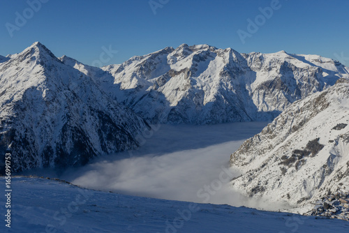 Snowy mountains rise above a blanket of cloud that cover valley