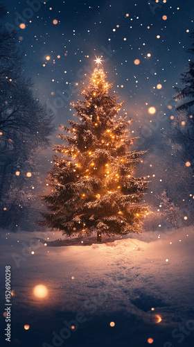 Snowy Night with Glowing Christmas Tree and Falling Snowflakes