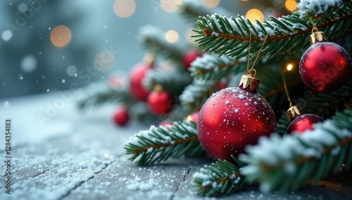 Snowy ornaments with red glass beads on fir branches, festive, ornaments