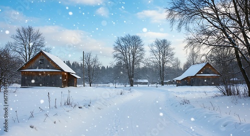 Snowy path leading to wooden buildings in a serene winter landscape under a cloudy sky capturing
