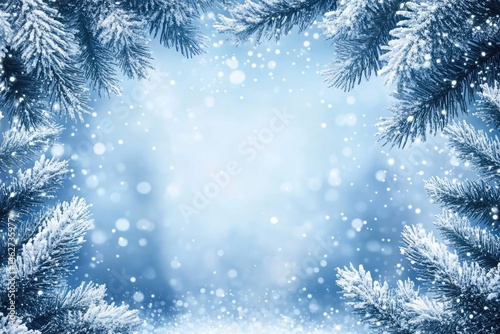 Snowy Pine Branches Covered with White Snow and Falling Snowflakes in Winter