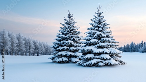 Snowy pines at dawn, winter landscape, tranquil scene, nature postcard