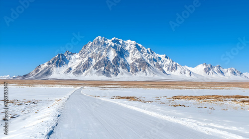 Snowy road leading to majestic winter mountains