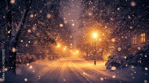 snowy road through a quiet town, with lampposts glowing warmly and snowflakes falling gently.