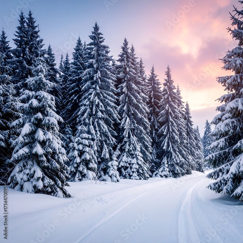 Snowy road through frosted pine forest under a pastel sky at dawn/dusk