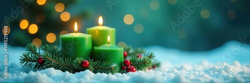 Snowy scene, three green candles, Christmas card concept, peace, still life, white