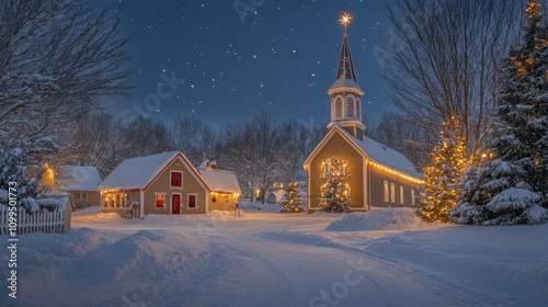 Snowy Village Christmas Eve Church Lights Gleam Brightly
