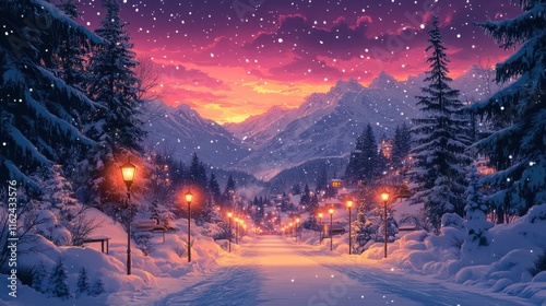 Snowy village street at sunset with snow falling, mountain backdrop and illuminated lampposts.