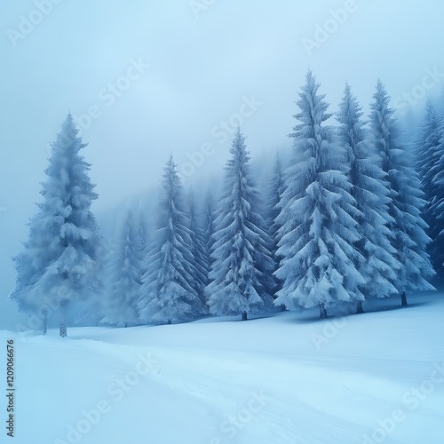 Snowy winter forest scene with fog.