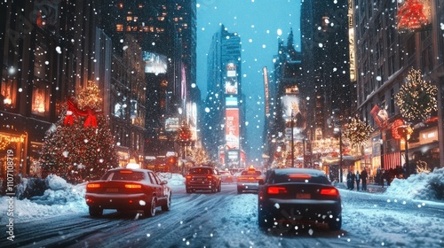 Snowy winter in the big city, the headlights of the approaching car. Close up view of a hatch at the level of the asphalt, image in the orange-blue toning