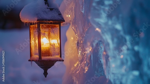 Snowy winter lantern glows near ice wall, twilight ambiance, holiday decor
