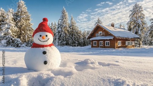 Snowy Winter Scene with Snowman and Cozy Cabin