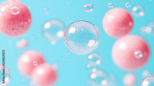 Soap bubbles floating in a clear blue sky symbolizing fleeting joy, with a minimalistic and bright tone, modern blurred background, and empty caption space on the side evoking a sense of chaos