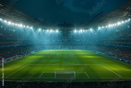 Soccer field close-up during an evening match with illuminated stadium lights and crowd. Empty football stadium at night with bright stadium lights illuminating the field.